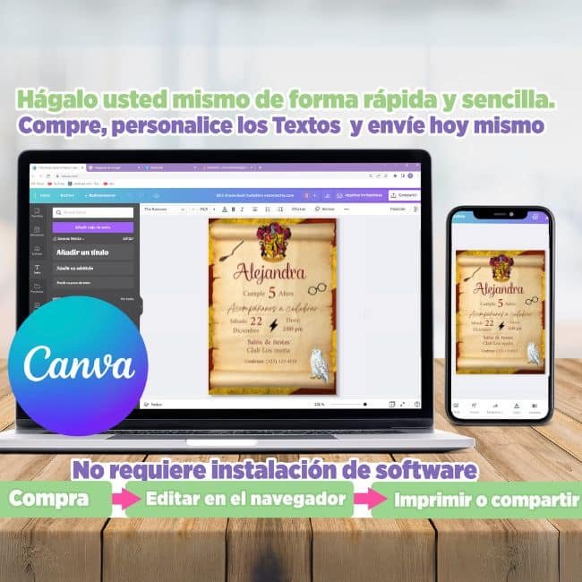 Con la Invitación de Harry Potter Editable en Canva, puedes personalizar todos los textos y datos de forma fácil, rápida y desde cualquier dispositivo. Acceso inmediato, diseño profesional y edición 100% intuitiva. Transforma tu celebración temática en algo inolvidable y descarga tu invitación al instante.