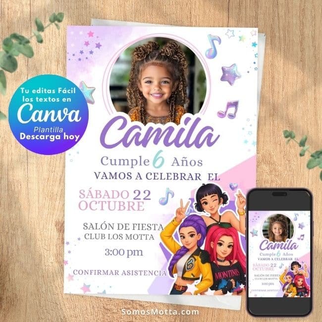 Nuestra de de las Guerreras Kpop Editable en Canva para Cumpleaños es perfecta para cumpleaños de niñas fanáticas del Kpop. Es una invitación ya terminada, fácil de personalizar y lista para enviar por WhatsApp o redes sociales. Ideal para padres que quieren una fiesta moderna, brillante y diferente. Si Prefieres una versión en video mira aquí de las Guerreras KPOP