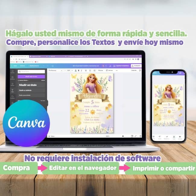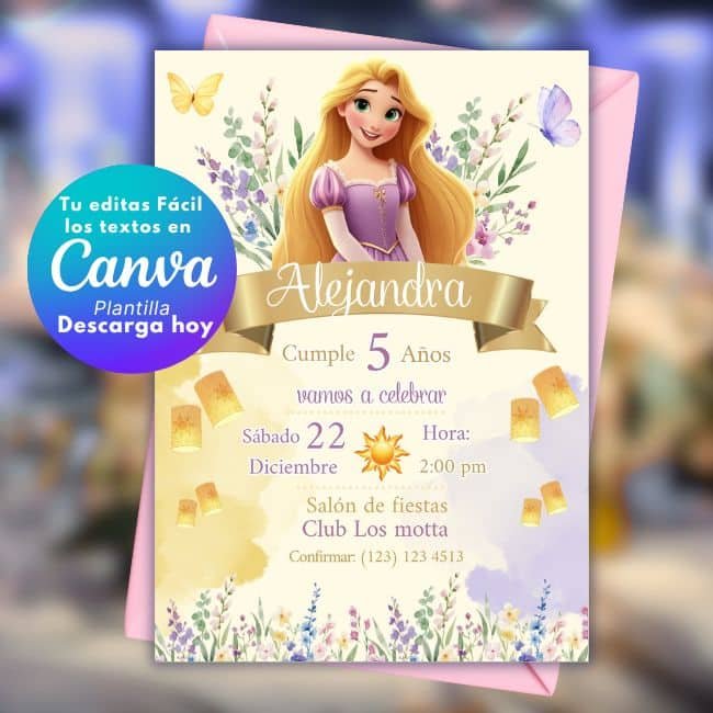 La Invitación de Rapunzel para Editar en Canva te ofrece acceso inmediato y la libertad total para ajustar textos y datos desde tu celular o computador. Ideal para crear una invitación única con un estilo encantador y lista para compartir en redes sociales o enviar a tus invitados. Disfruta una edición sencilla y personalizada en minutos.