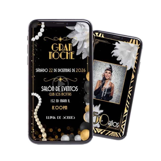 Celebra por todo lo alto con nuestra Video Invitación 50 Años Estilo Gatsby (Negro y Oro), la solución perfecta para quienes desean un toque de distinción de los años 20. Al ser una invitación personalizada, nosotros nos encargamos de todo el trabajo de edición profesional por ti. Solo dinos tus datos y recibirás un video de alta calidad, listo para compartir por WhatsApp y redes sociales. Ahorra tiempo y sorprende a tus invitados con un diseño premium que refleja el brillo de tus 50 años. ¡Haz tu pedido hoy y recibe tu invitación terminada!