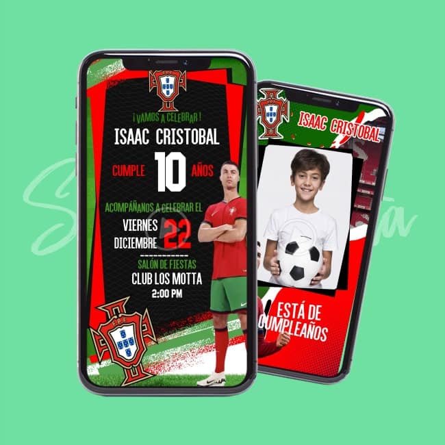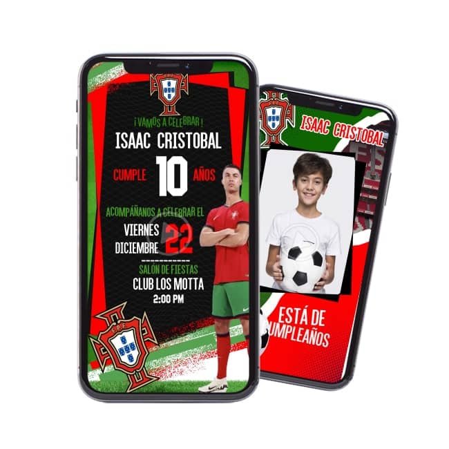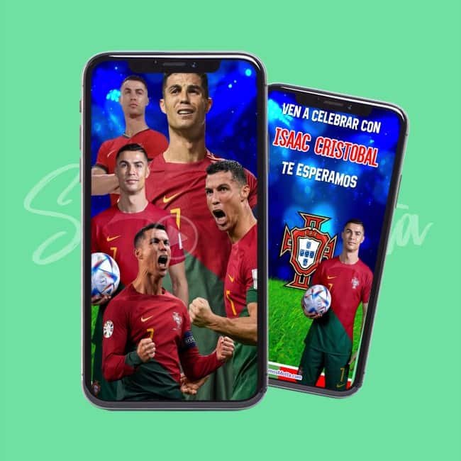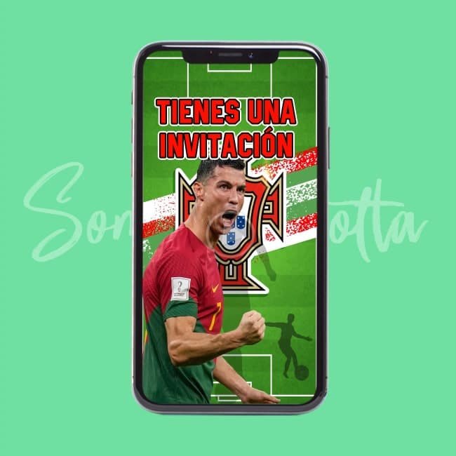 Cristiano Ronaldo, CR7, fútbol, gol, balón de oro, Real Madrid, Manchester United, Al-Nassr, video invitación, fiesta infantil, cumpleaños fútbol, jugador favorito, camiseta CR7, celebración fútbol, invitación lista, invitación personalizada