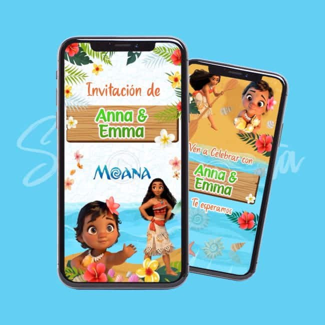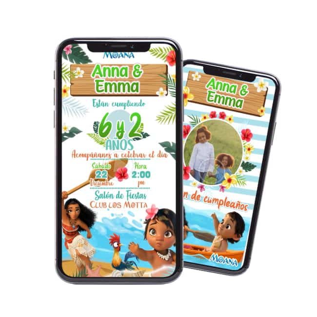 Celebra la magia de crecer con nuestra Video Invitación Moana: Hermanitas Bebé y Grande, la solución perfecta para unir la ternura de Moana Bebé y la valentía de Moana Aventurera en un solo diseño profesional. Olvídate de editar plantillas complicadas; nosotros realizamos la personalización completa de los datos de tus dos pequeñas para que recibas un video listo para compartir por WhatsApp y redes sociales. Ahorra tiempo y sorprende a tus invitados con una invitación digital personalizada de alta calidad que celebra la conexión especial entre hermanas. ¡Haz tu pedido hoy y recíbela lista para enviar!