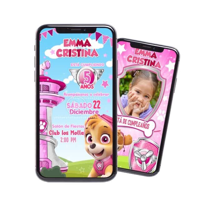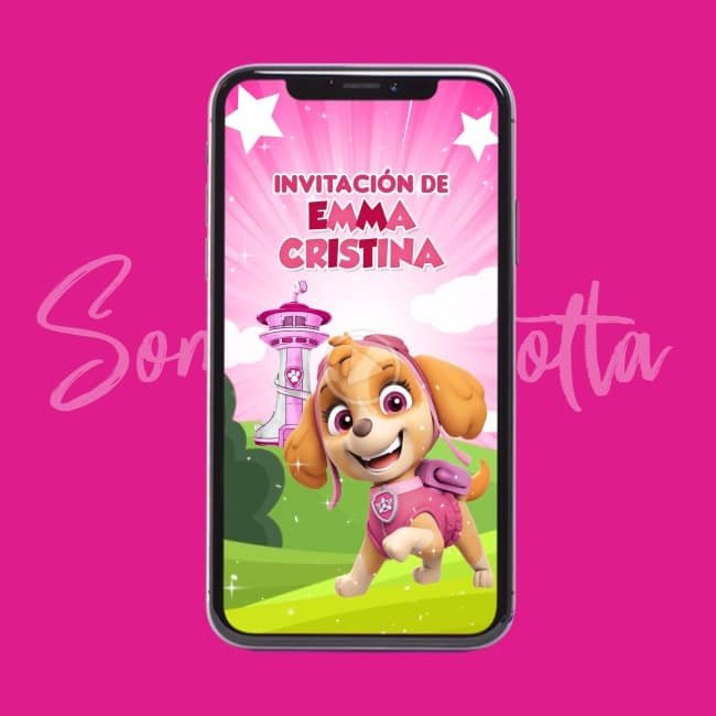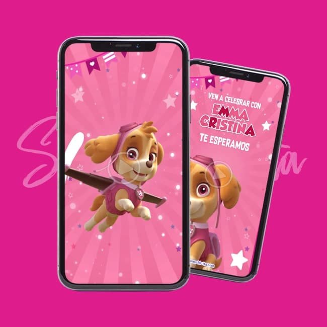paw pate, paw pateol, paw patri, paw patroñ, pow patrol, Skye, Paw Patrol, Patrulla Canina, Chase, Marshall, Everest, Rubble, Zuma, Rocky, cumpleaños infantil, fiesta de niñas, invitación animada, fiesta temática, decoración Skye, invitación digital rosa, cumpleaños temático Paw Patrol