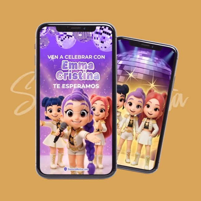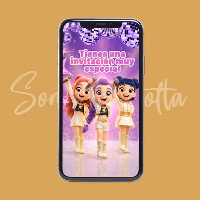El Video Invitación Personalizada Guerreras Kpop para WhatsApp es un servicio completo donde nuestro equipo diseña y anima un video exclusivo con los datos reales de la fiesta.