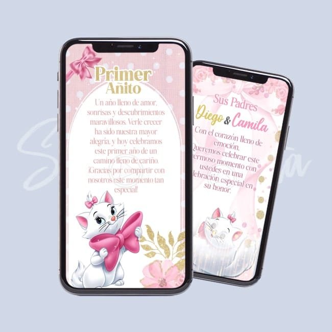 🐾 Dale a tu princesa la mejor fiesta con una invitación digital animada, lista para enviar. Inspirada en la ternura de Los Aristogatos, sorprenderá a tus invitados y hará que el primer cumpleaños sea inolvidable.